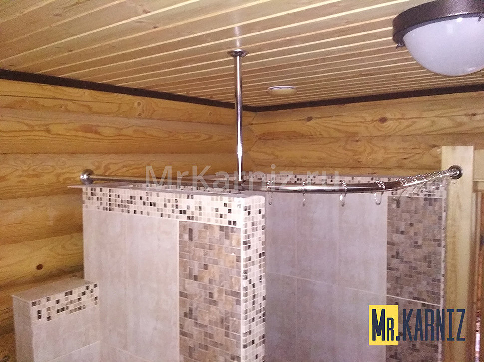 Основой штанги является цельная стальная труба. На этапе производства ей задают требуемую форму, ориентируясь на размеры бортика ванны. Крепят карниз на кронштейны, закрепленные в стенах саморезами/шурупами, или на поворачиваемые крепления к потолку. Второй способ используется реже.